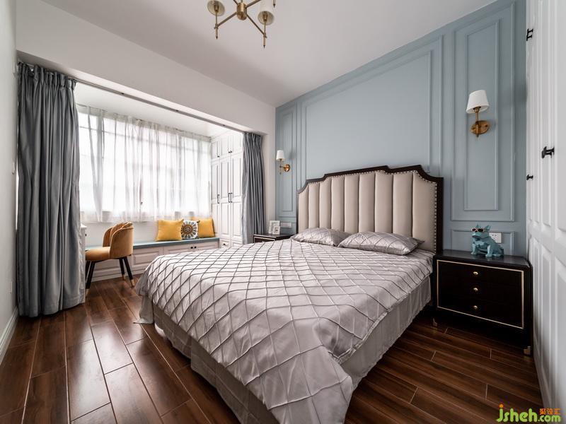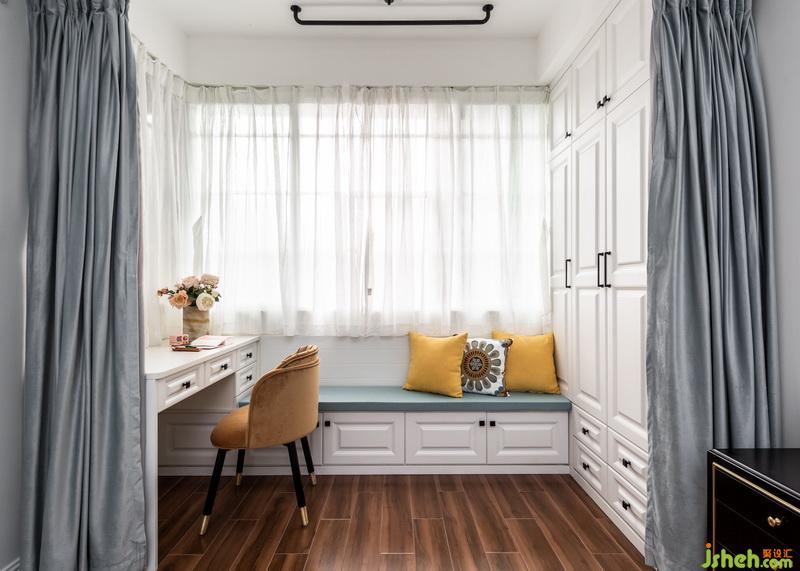 將原來(lái)的陽(yáng)臺(tái)空間納入臥室空間,拆掉原有阻隔臥室通風(fēng)和采光的厚墻,用絲絨材質(zhì)的窗簾作為隔斷,絲絨材質(zhì)的隔音效果和95的遮光度,讓臥室空間既是一個(gè)整體,又是兩個(gè)獨(dú)立的空間,原本臥室外面的陽(yáng)臺(tái)成為了集休閑儲(chǔ)物辦公為一體的多功能空間。顏色選用和背景墻一直,讓空間更為協(xié)調(diào)。