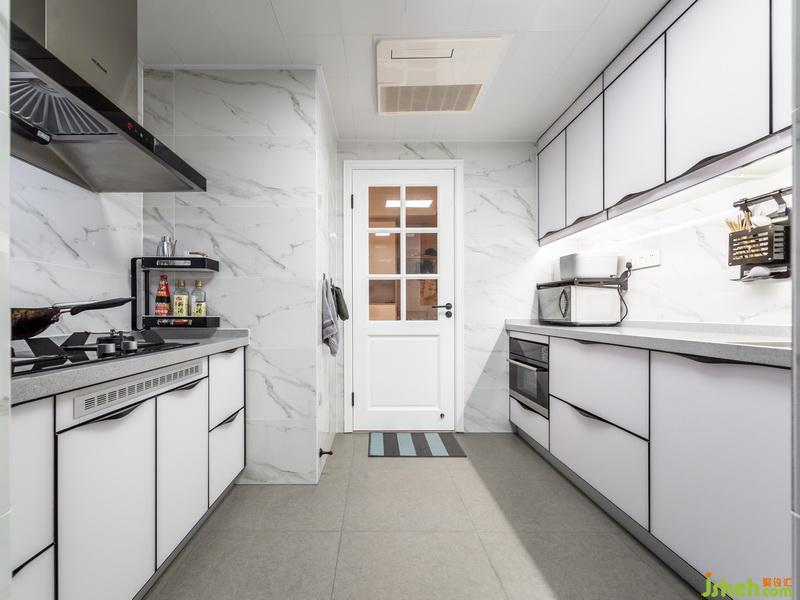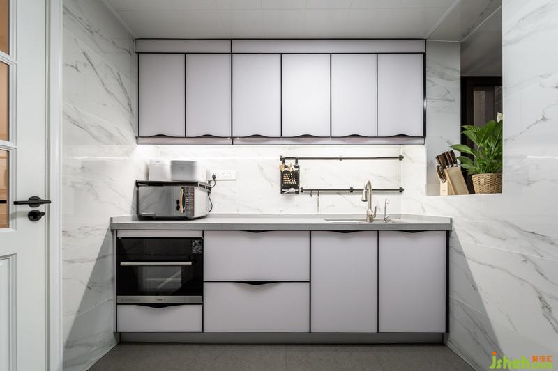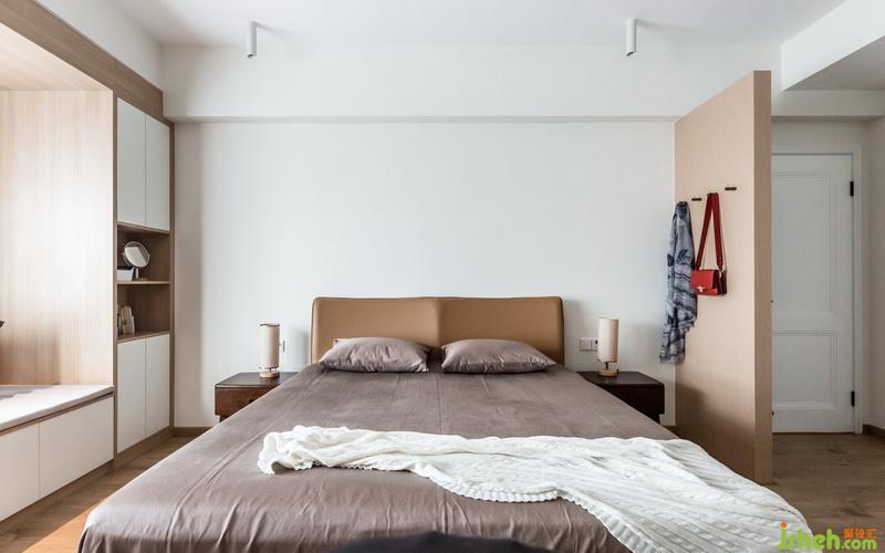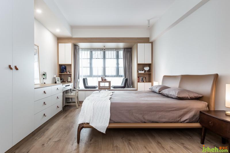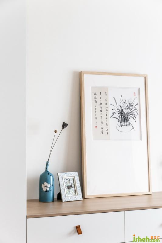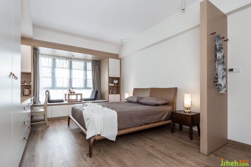 閑暇時(shí),執(zhí)一紙素箋,蘸一點(diǎn)淡墨,書寫繪畫,修養(yǎng)心性。床尾的書桌,是老房子用了多年的寫字臺(tái),床頭柜的臺(tái)燈也陪伴家人多年。用書柜加寬的飄窗臺(tái),多年累下來的書本全部收納于此,小憩、品茶、閱讀,清風(fēng)微拂,白紗輕揚(yáng)。好不自在。門口的木飾面隔斷,阻隔客廳來訪視線,保證隱私。裝上幾個(gè)精致的小掛鉤,便是個(gè)多功能的衣帽架。