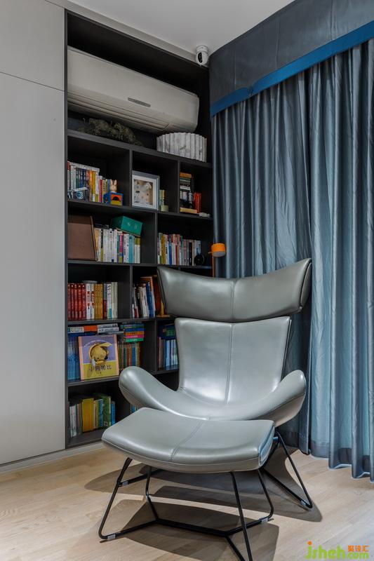 整個客廳有一組比較大的柜子,在這個柜子里面同時滿足了三大要求,一個就是閱讀空間,就是閱讀角;二是那個開放空間就是給孩子閱讀的空間,跟媽媽之間的互動空間。第三就是我們隱藏的書桌的空間,可以滿足她先生在家里辦公,但是平常不用的時候,可以把它合起來。