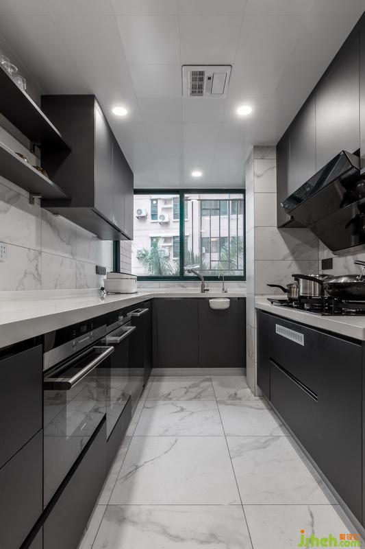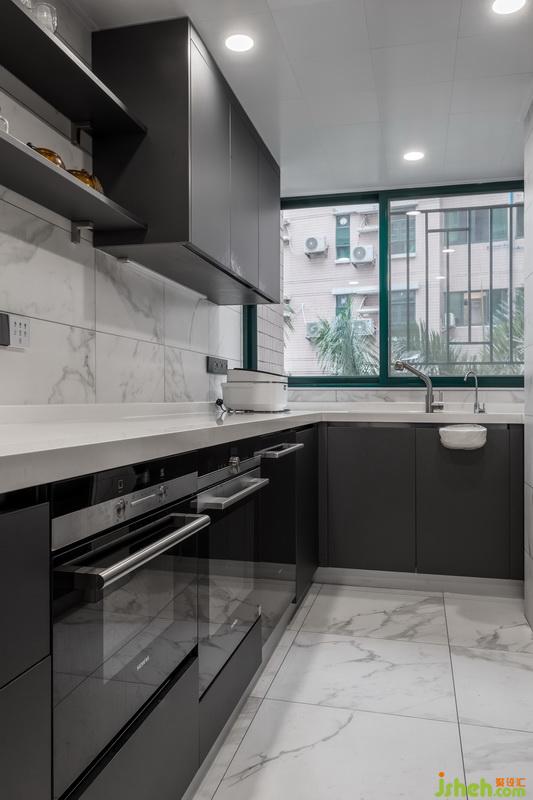 高級感灰色櫥柜,超大U字型操作臺,可與餐廳傳遞美食與感情的小窗洞,無形散發(fā)出高雅格調(diào)的煙火氣息。