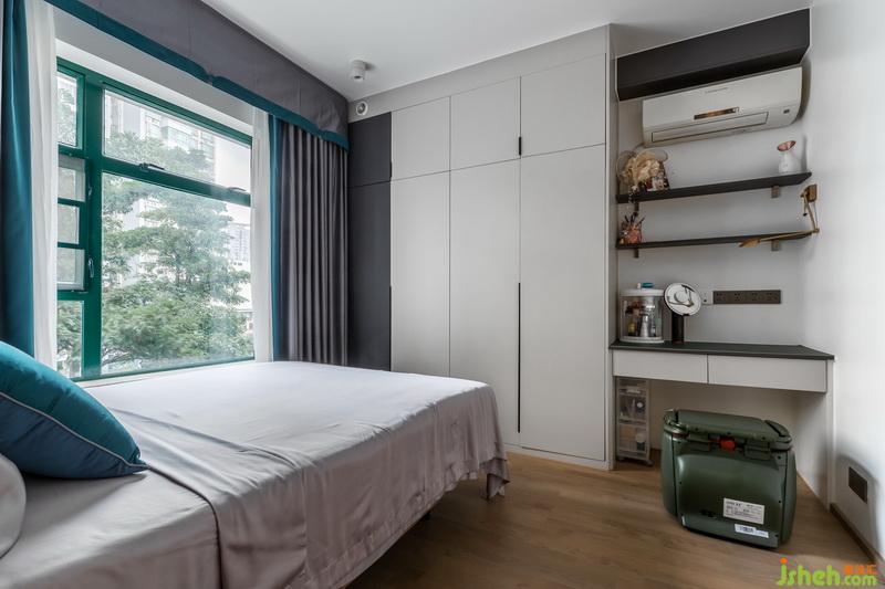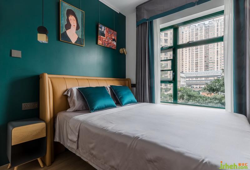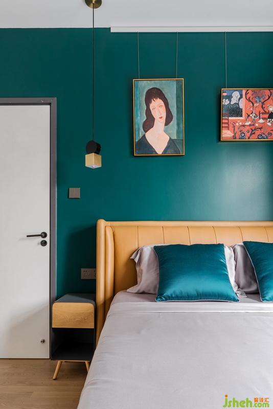 墨綠色背景顏色是女主人的最愛,灰色主體墨綠邊邊窗簾與背景呼應,黃色皮質(zhì)床,軌道式油畫,一種無與倫比的高級質(zhì)感又流露了出來。