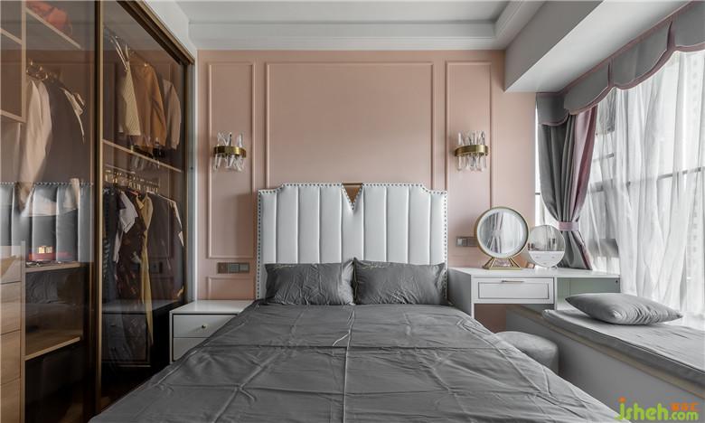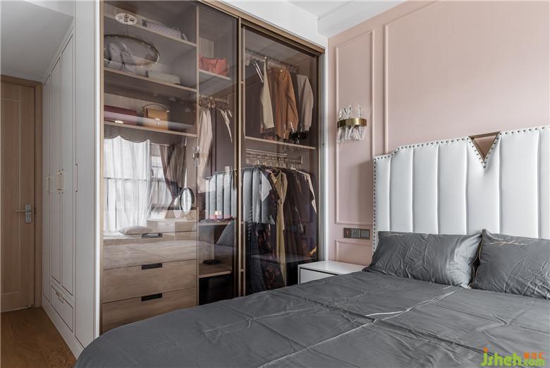 床頭背景以甜蜜溫馨的煙粉色為主調(diào),延伸客餐廳的石膏線條,其他墻面以淺灰色為輔,中和煙粉色帶來(lái)的甜膩,大面茶色玻璃衣柜使空間通透性更好,柜體里面的層板都有燈帶,透過(guò)里面的燈光,從外面看質(zhì)感是很高級(jí),也是主人喜歡的輕奢感。