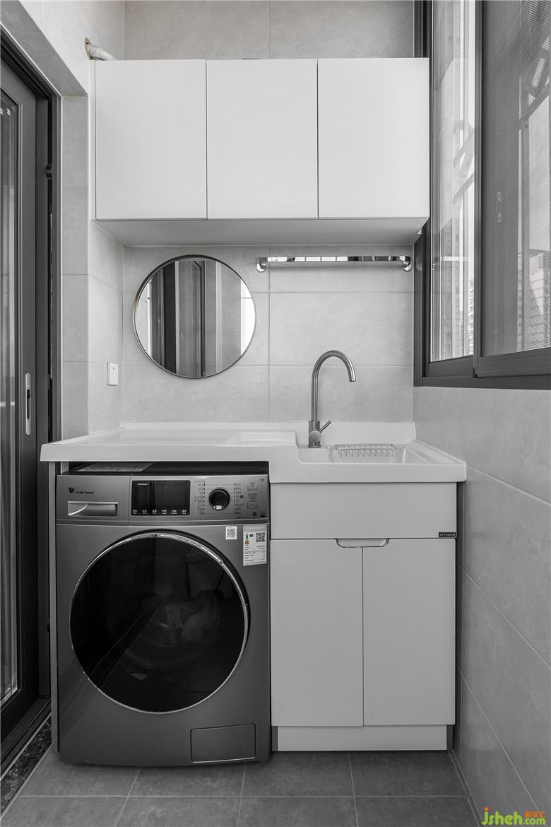 陽臺的空間當(dāng)然也不能浪費(fèi),白色洗衣機(jī)柜與灰色地面瓷磚搭配顯得簡單大方