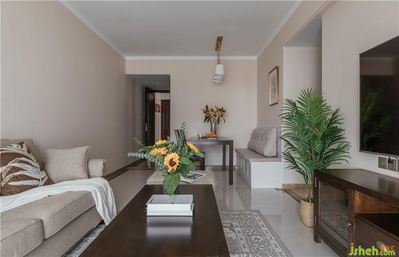 電視柜旁,放置了一棵仿真的散尾葵,編織籃里懶懶地躺著許多鵝卵石。一切都漫不經(jīng)心,一切都剛剛好。