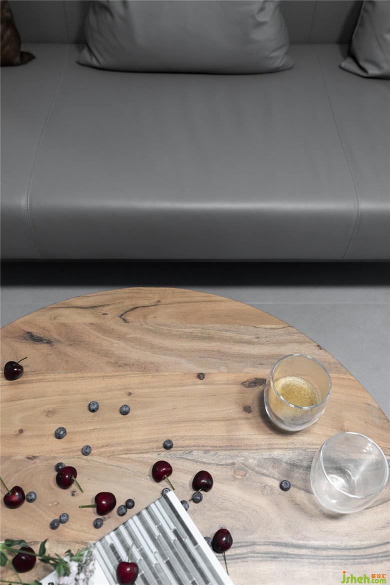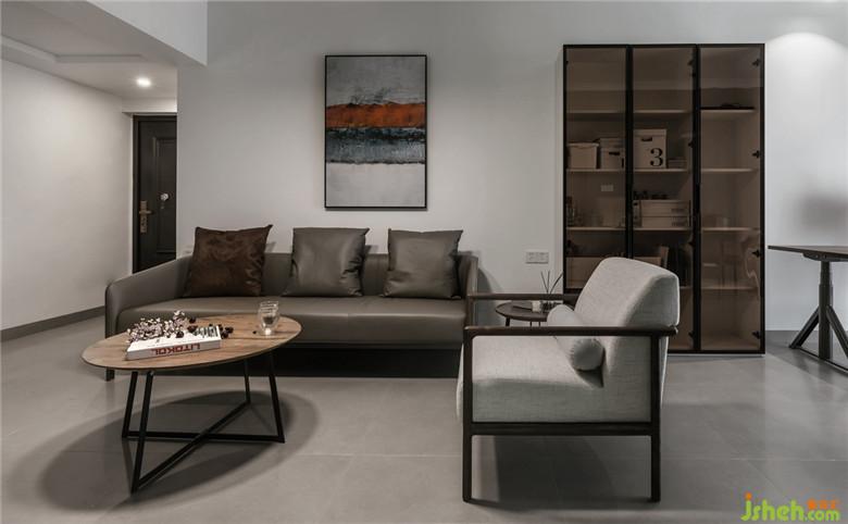 餐廳;深色的餐桌餐椅與灰藍(lán)色的墻面搭配,充滿輕重緩急的節(jié)奏感,旁邊的置物柜,透明玻璃的柜門,簡單利落柜體線條