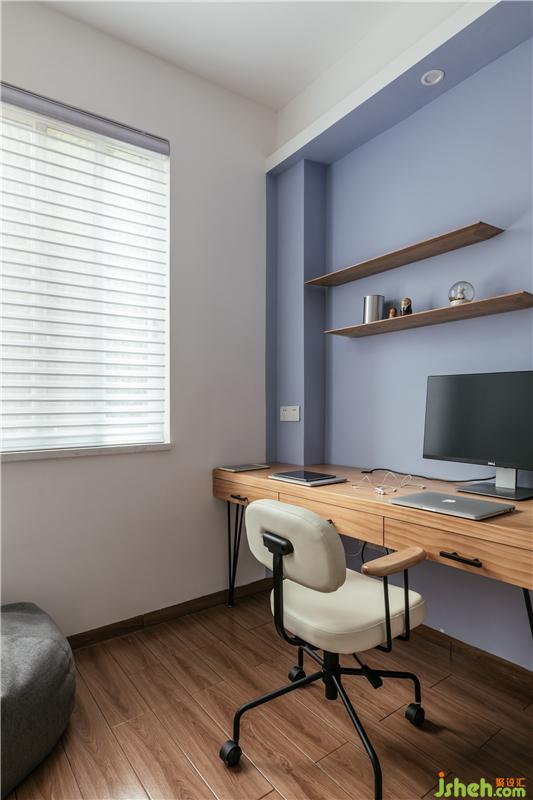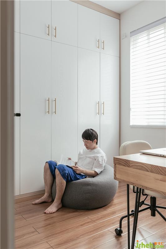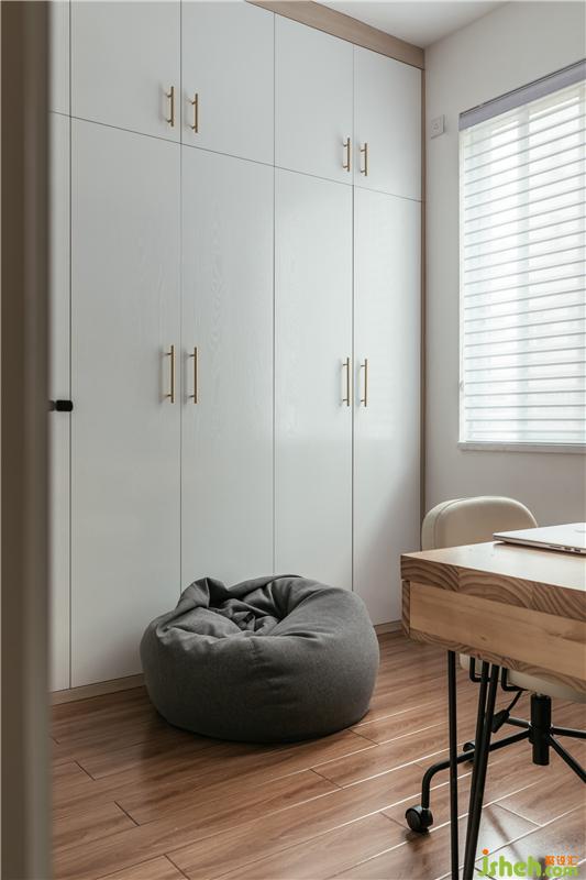 這個空間既是衣帽間,又是書房。除了整排的大衣柜,還兼顧了書柜、雙人書桌,滿足業(yè)主現(xiàn)在的需求。日后有了小朋友,可移動書桌,改變成為小孩房。