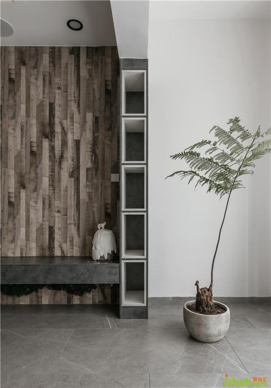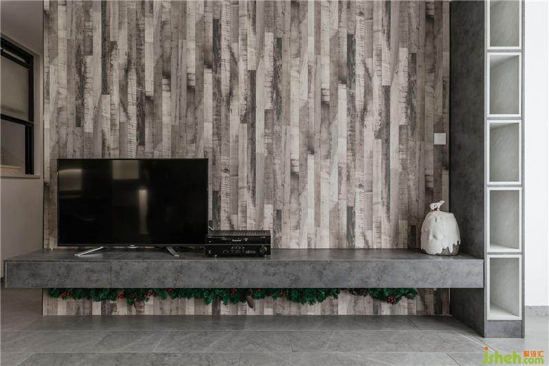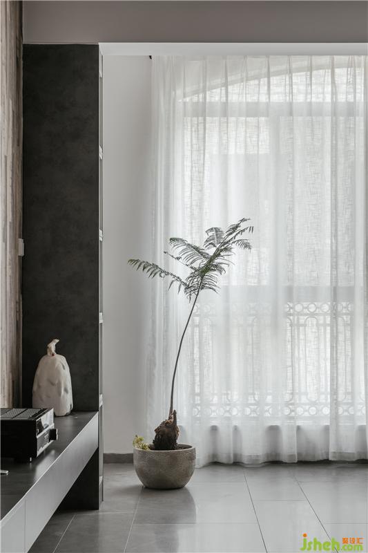 電視背景的一角,簡單的一株植物在此就已足夠,空間不用太滿,留多一點給日后生活填充的地方。