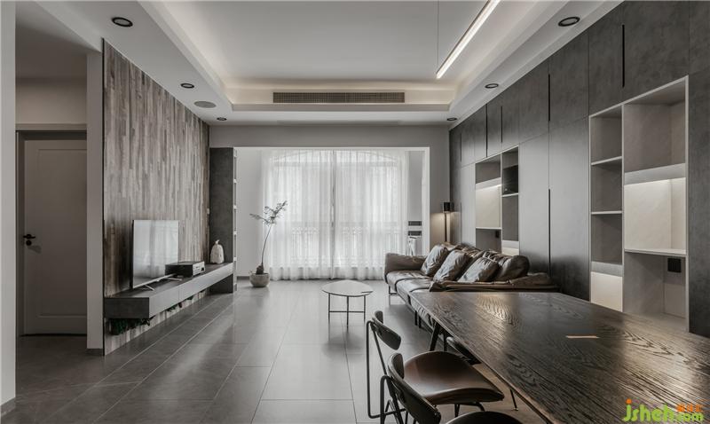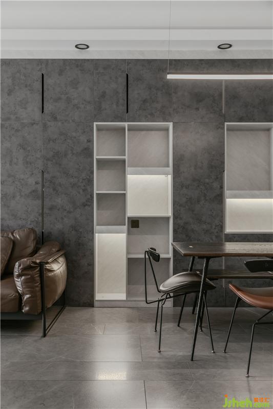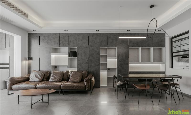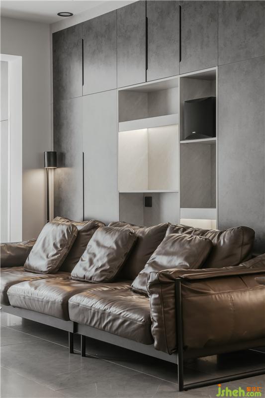 男主人愛死這儲物柜的色調(diào) ,他說當光打在上面時,那種若聊若現(xiàn)的基理效果真的是百看不厭,在這個空間中,沙發(fā)背景裝飾柜的比例非常大,所以在款式與色板上的挑選就尤其重要。