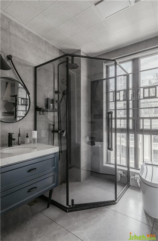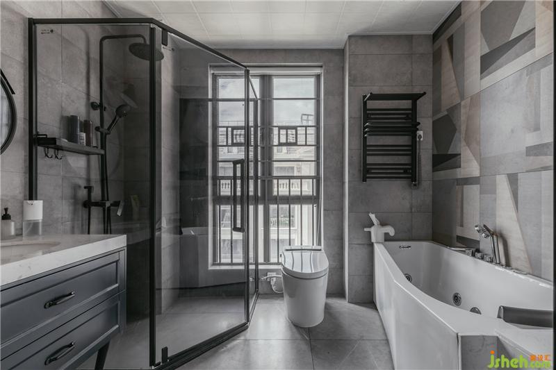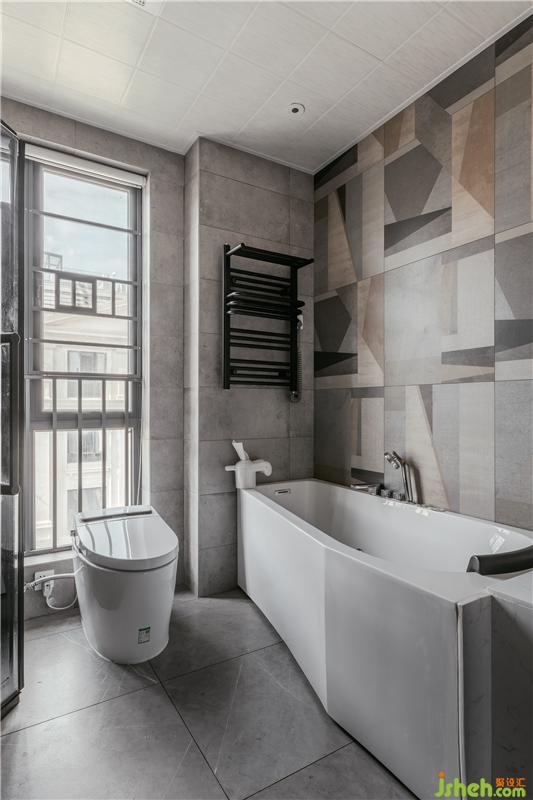 主衛(wèi)空間大,所以功能安排也齊全,沐浴區(qū),洗漱區(qū),泡澡浴缸等等全都擁有。主衛(wèi)的風(fēng)格依舊是以灰色調(diào)為主,在浴缸的一面墻上運(yùn)用了不規(guī)則呈幾何性的花磚來進(jìn)行空間點(diǎn)綴,干凈,內(nèi)斂,現(xiàn)代依舊是我們想表達(dá)的主題。