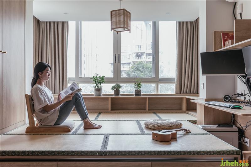 在榻榻米的一側,我們還為男主人設計出了他的辦公區(qū),腳下區(qū)域留出空間,更加舒適~