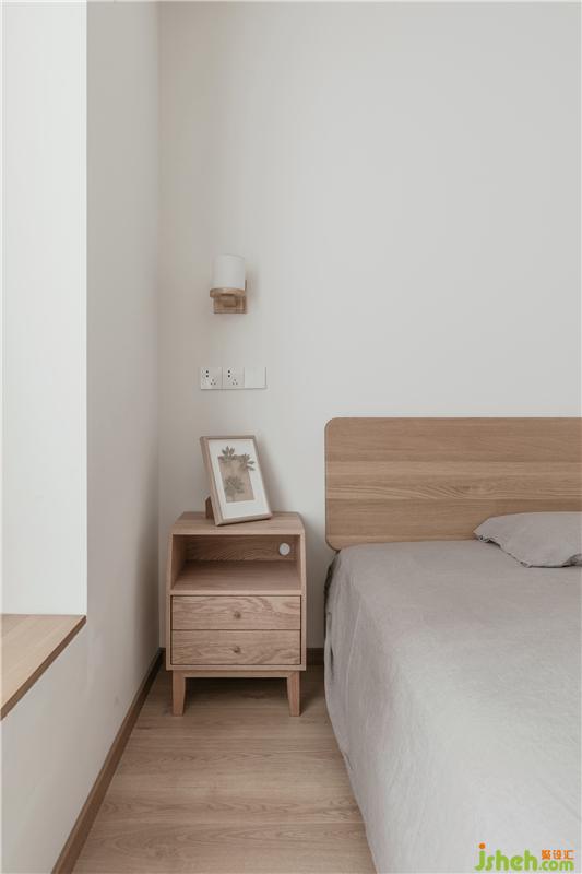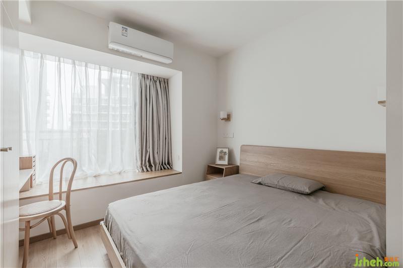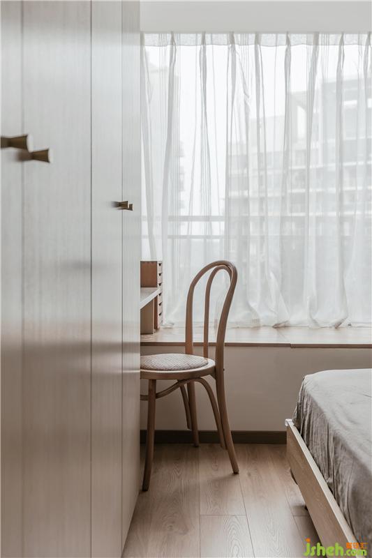 主臥的整體設計是非常溫暖,寧靜的,柜子的木色選擇,以及家具的風格都很有考究,衣柜的一側作為書桌滿足了女主人的辦公,超大的飄窗,讓空間顯得更寬敞明亮。