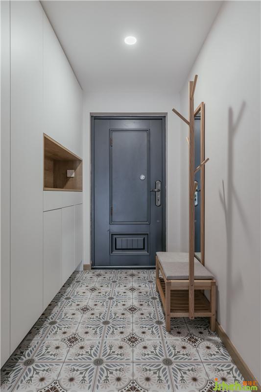 一側(cè)設(shè)立了滿墻的玄關(guān)柜,滿足了全家玄關(guān)收納的需求。地面使用復(fù)古花磚鋪貼分割空間,同時(shí),增加空間趣味性。