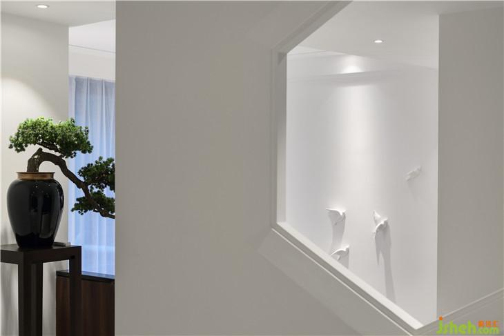 兼容漢代美學與現代主義的極簡法則,樓梯間入口的設計以深木飾面與灰調、木色與素白描繪空間。貫通兩個樓層間的墻面運用了白鴿翱翔的方式處理,與素凈的白墻、旋轉的吊燈,共同勾勒出清雅恬淡的人文精神世界,清透而綿長。別墅裝修設計
