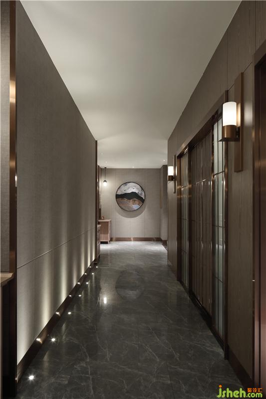 穿過走廊,金屬質感的墻面使空間顯得更為開闊,明朗。禮賓落座,環(huán)顧四周,深淺相間的棕黃木色讓人靜心靜氣。偶有一點盆栽的翠綠,好像少女嘴角的美人痣。