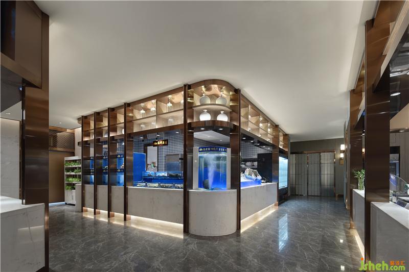入口海鮮明檔,燈光明快。細聽水聲潺潺,仿佛魚蝦悠閑自得。古銅色金屬立架擺放十余種茶品,東方飲食的儀式感從食材的挑選開始。
