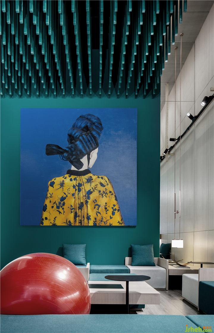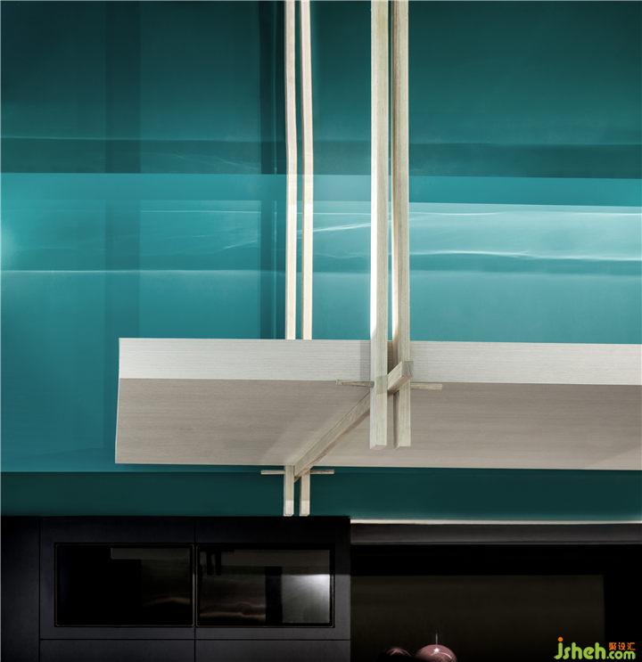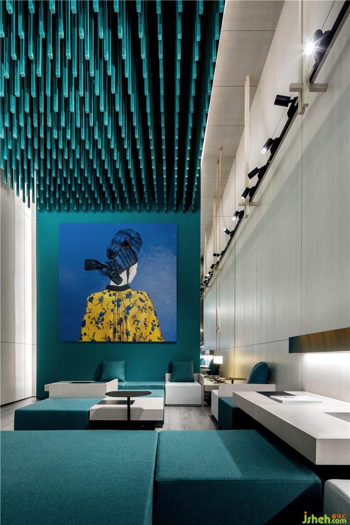 天然祖母綠成為空間主色調(diào),這一藍(lán)色與綠色的混合體,蘊(yùn)含明晰的純粹之感,于今日復(fù)雜世界來說,更具有視覺上的沖擊力。綠色亦契合本案茶飲的自然健康理念,傳遞出品牌的溫度和愿景,以萬物復(fù)蘇的象征意義賦予場(chǎng)景空間新的生命力。餐廳設(shè)計(jì)