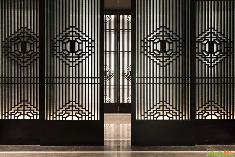 例如:空間中有正定本土木格柵屏風(fēng),有皇家宮殿常用的金柱腳(用純銅替代),極簡的宮廷燈具,檀木色的木質(zhì)空間主調(diào),都在訴說空間元素皆出身高貴。