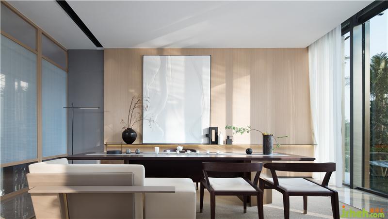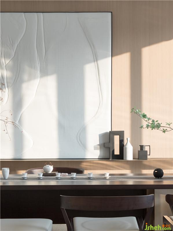 屏風模糊了空間界限,茶室似隔似合,藝術畫的選擇以留白注解,若隱若現(xiàn)。器皿選色素雅,插花藝術更是展現(xiàn)了不一樣的空間詩意美學。文人墨客,清茶一杯,談吐風雅;蕓蕓眾生,一茗在手,靜謐中返觀自心。