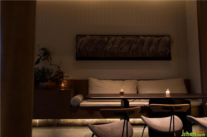 卡座區(qū)位于酒吧空間最里的位置,墻面的蘆葦裝置內(nèi)設(shè)燈光,裝修設(shè)計(jì)打造出蘆葦似動(dòng)非動(dòng)的搖曳感,卡其色軟包與粗麻編制的紋案形成強(qiáng)烈的反差感,體現(xiàn)出小漁村的古樸安靜的氛圍。