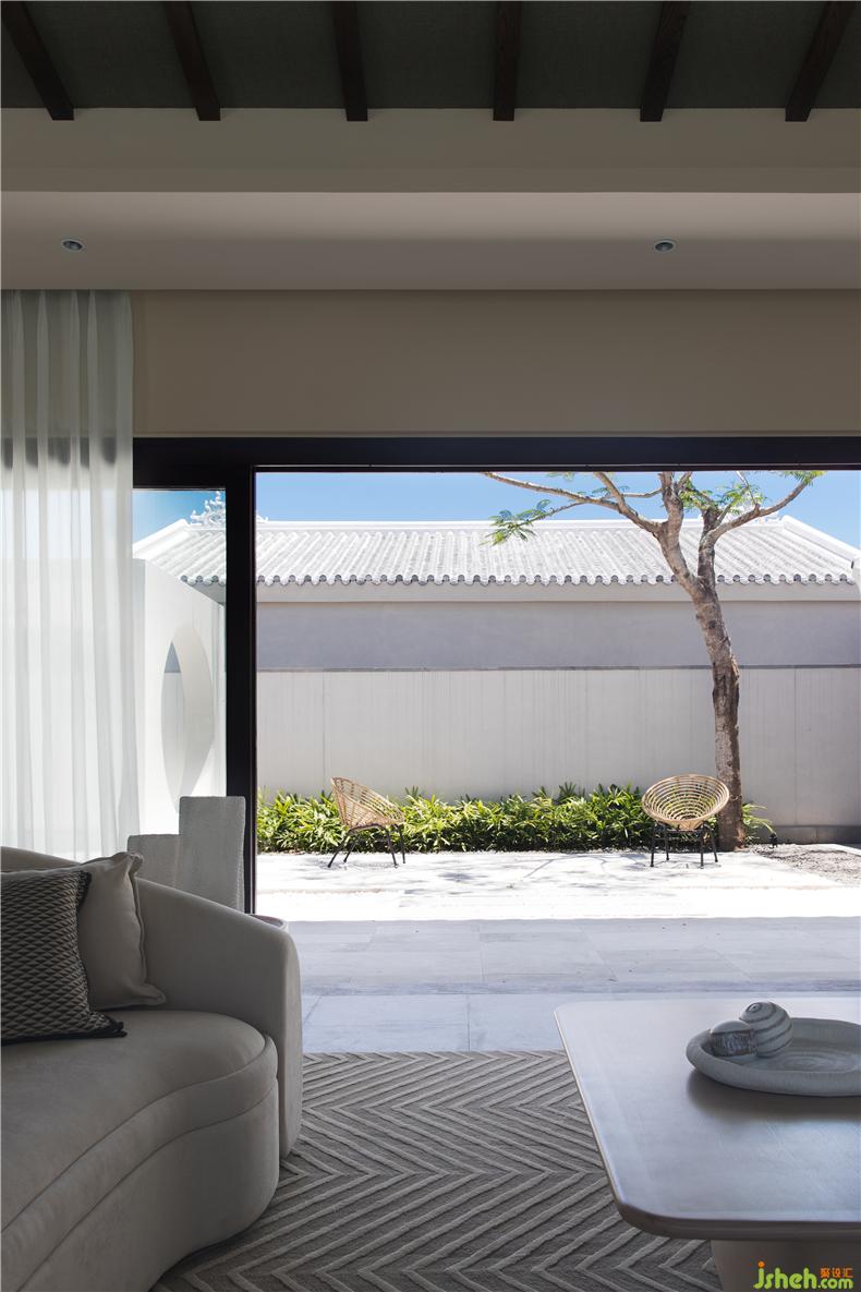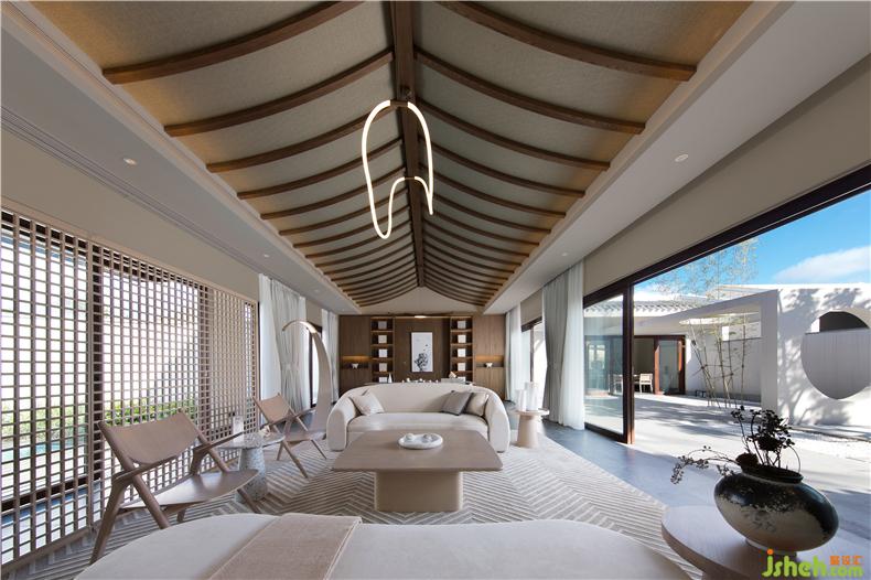 客廳選用具有柔和弧度的家具,模擬候鳥的姿態(tài),營造自然的美感,掛畫也選用盛昌年的《柳燕圖》圍繞主題,旁邊的茶室以及餐廳也都選用平靜舒服的色調(diào),其中燈家具形態(tài)也以“候鳥南飛”、海上礁石為靈感,在空間的飾品選擇上秉承著少精于多的理念,多選用自然質(zhì)感的器皿飾品等,讓整個空間顯得精致卻不世俗,自然氣息也更加濃厚。