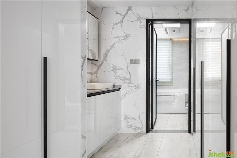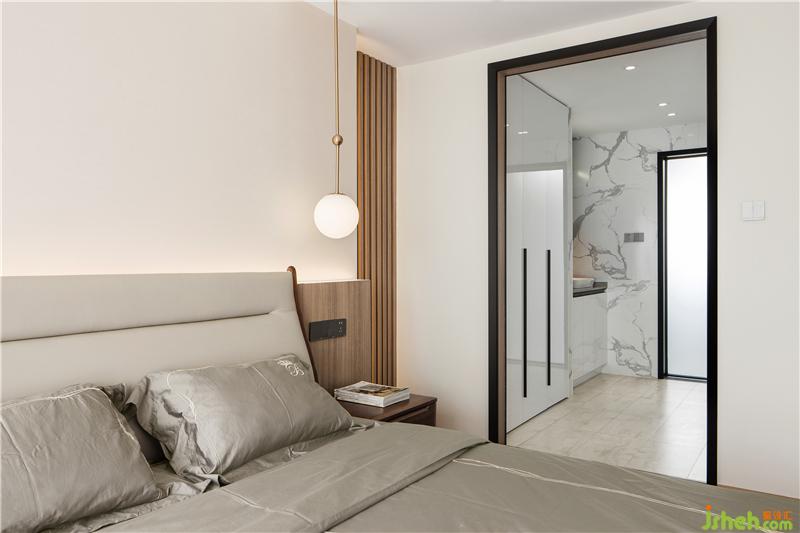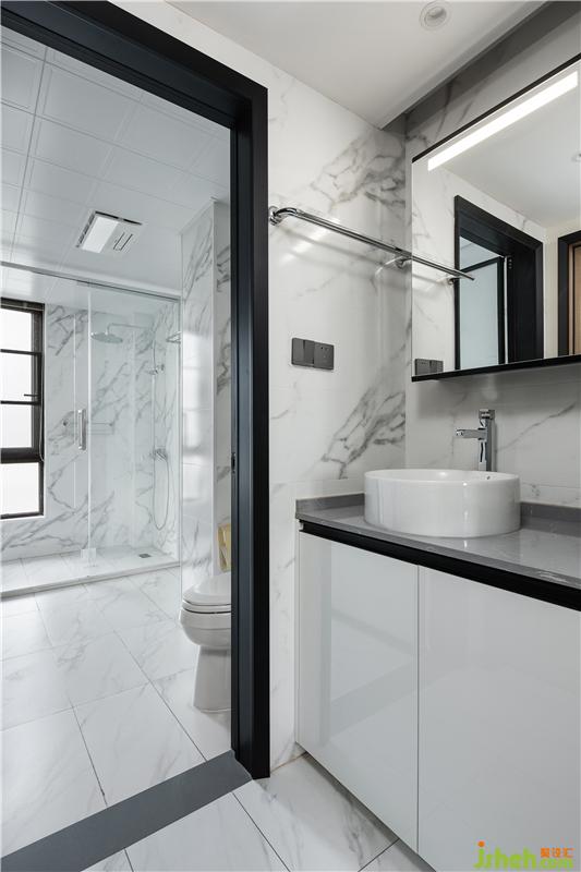 空間細(xì)節(jié)采用輕量化的工業(yè)設(shè)計(jì)理念,門窗套采用30mm的斜切窄邊框,窗臺(tái)是單邊石英石,房門用天地鉸鏈代替?zhèn)鹘y(tǒng)合頁。衛(wèi)生間門用的是合金窄邊框玉砂玻璃,能讓自然光最大進(jìn)入。