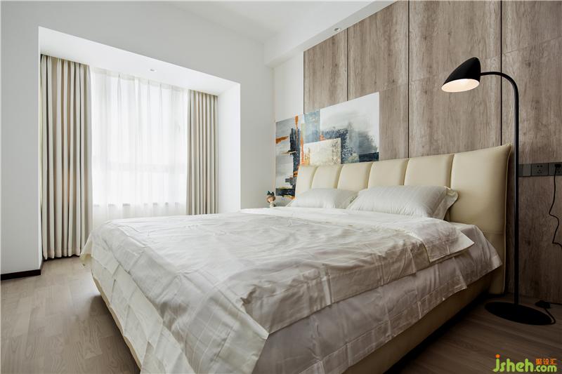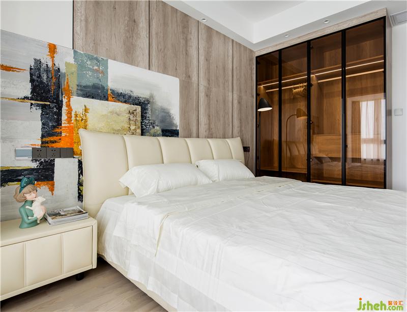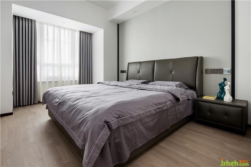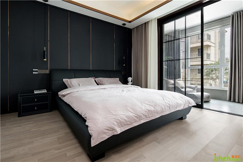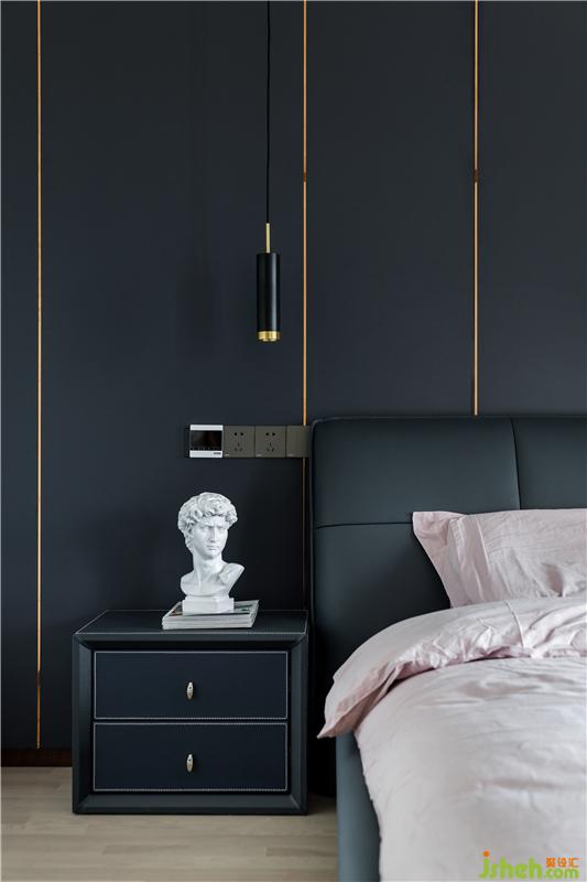 主臥定了深色的基調(diào),原本硬包的背景后來改為板材,干練許多。這樣大膽的空間搭配得益于甲乙雙方高級別的信任,落地后的效果可以消滅一切懷疑。地板用了金鋼鉑林的進口系列,質(zhì)感確實不錯。