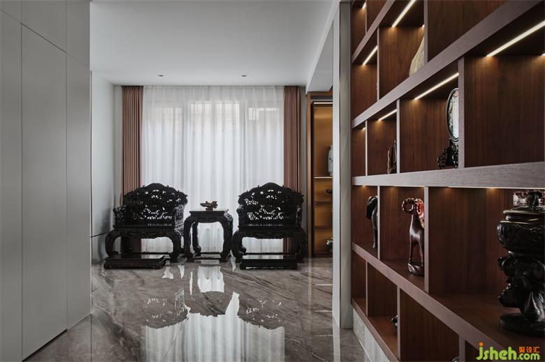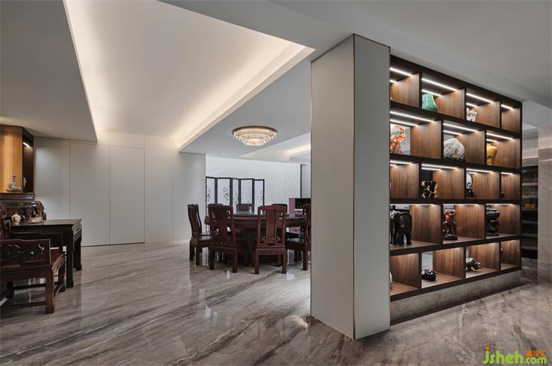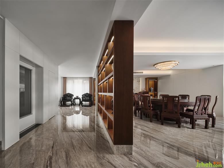 電梯廳與中餐廳之間設計了鏤空裝飾柜作為分隔
