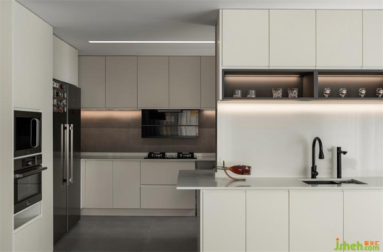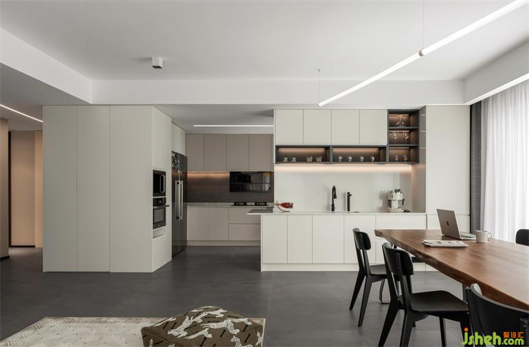 The process of preparing food continues from the kitchen to the water bar, and then to the 3.5-meter long table. The design blurs the boundaries between kitchens and the definition of space, which can release the gentleness of becoming a monk. In the works, the gentle home art is the hidden C position. A large number of milk white cabinets contain enough storage with minimalist door panels, and the smoke and fire flavor of life is implied in them.