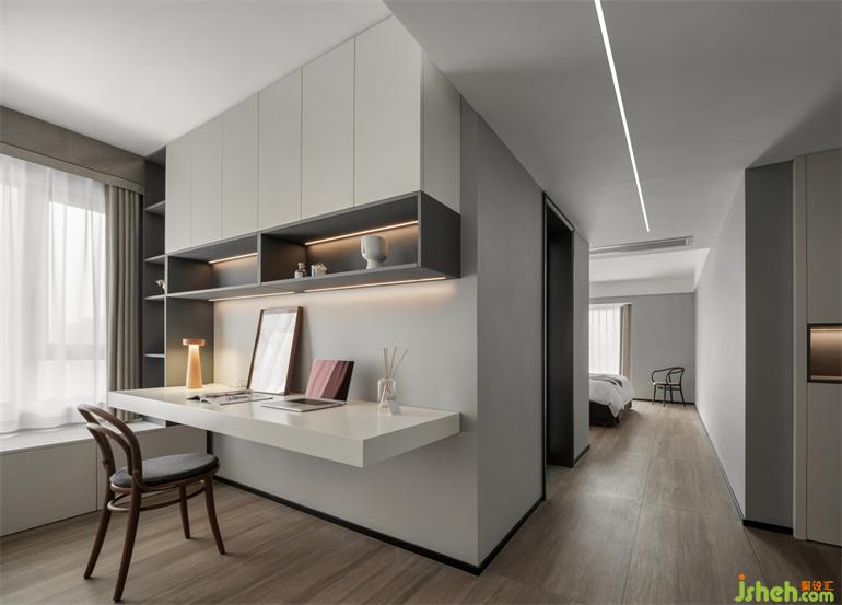 閱讀區(qū)設(shè)計在主臥套房的北端,懸浮書桌與飄窗錯落安放。妻子溫柔盤腿窗邊手捧文學書,拉開窗簾就可欣賞窗外美景,先生打開電腦正襟危坐規(guī)劃事業(yè)藍圖。藝術(shù)住宅設(shè)計這便是簡單生活的美好畫面。