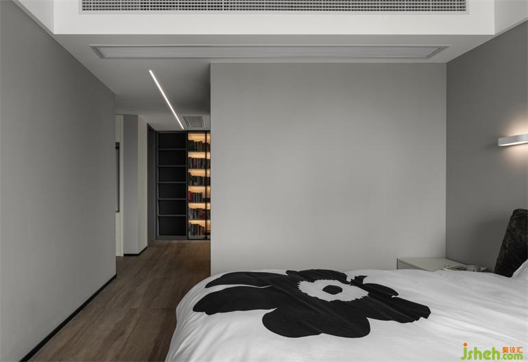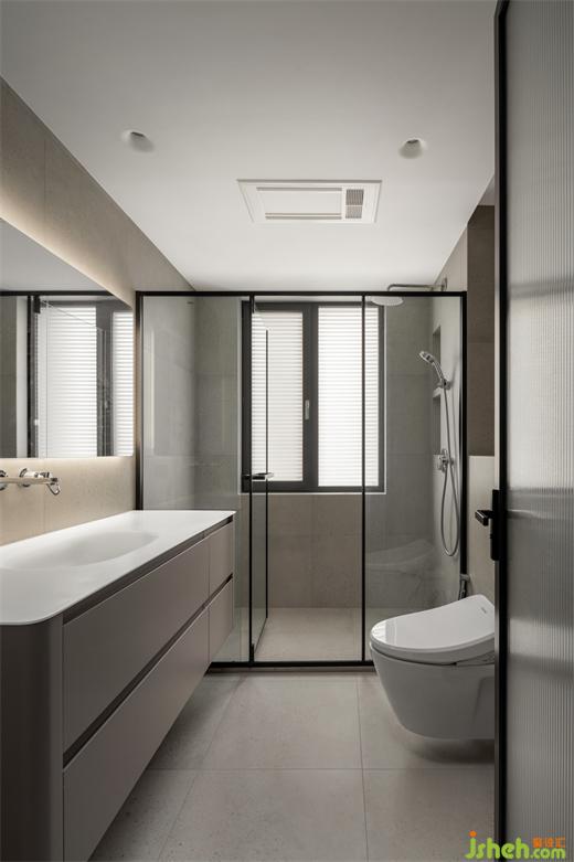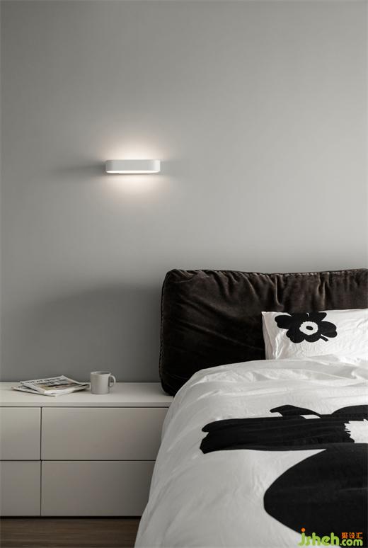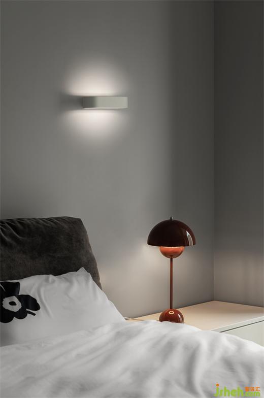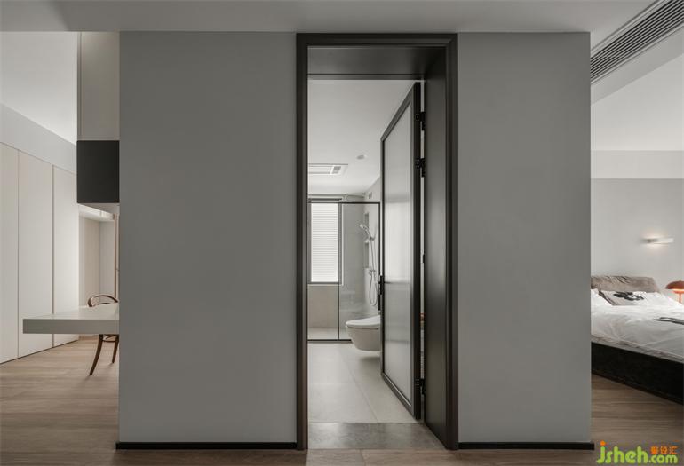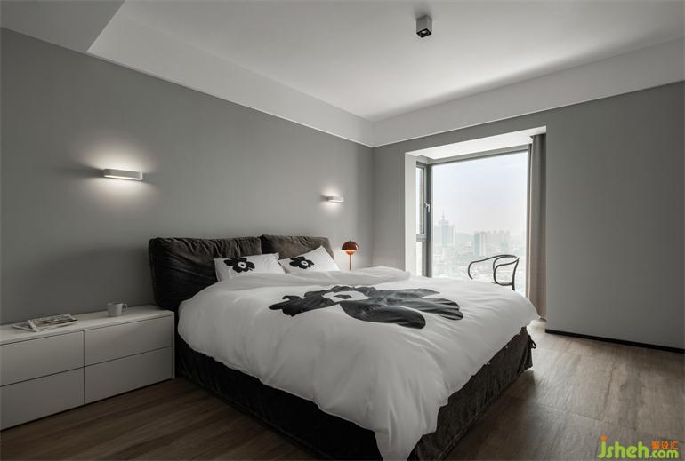 藝術(shù)住宅設(shè)計臥室和衛(wèi)生間采用米灰主題,透過落地玻璃窗可以放眼城市的容貌,紅色臺燈點綴了幸福,安靜之中透出生活的小驚喜。