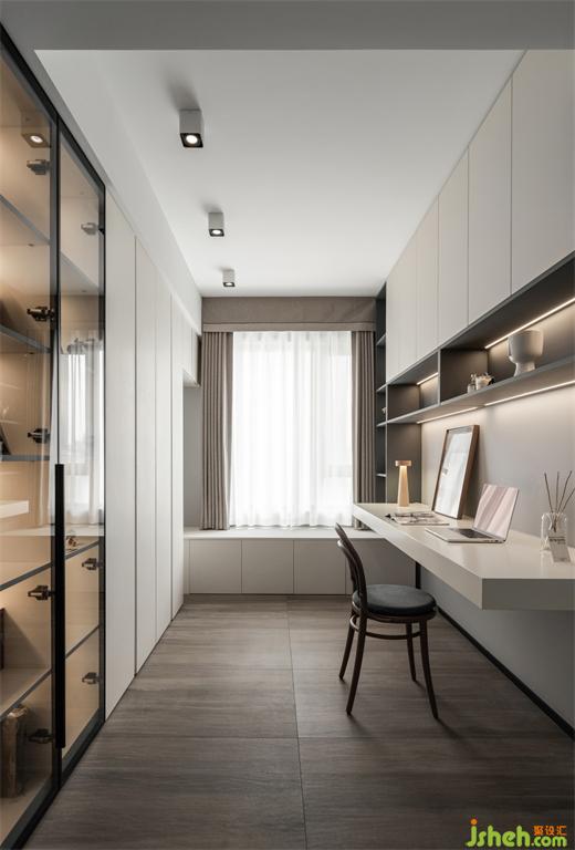 The reading area is designed at the north end of the master suite, with floating desks and bay windows scattered. The wife is gentle and cross legged, holding a literature book by the window. When the curtain is opened, you can enjoy the beautiful scenery outside the window. The husband opens the computer and sits down to plan his career blueprint. This is a beautiful picture of simple life.