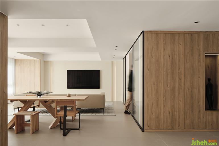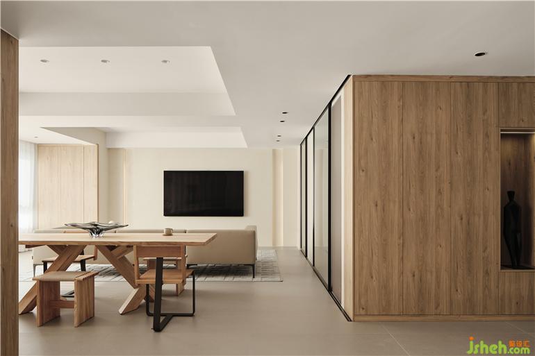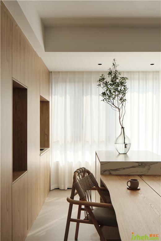The composition of the large horizontal hall on the first floor spreads the living room, dining room and study flat, and the interaction between spaces becomes direct and clear. The furniture in log color matches the wall of milk coffee, showing the gentle expression of life. The dining room and the water bar are integrated. The vertical cabinet separates the dining room from the study. The white steel plate sculpture stands in the niche, making the dining environment blend into the tone of contemporary art.