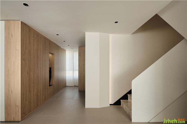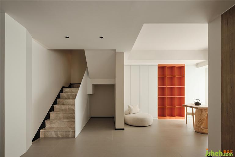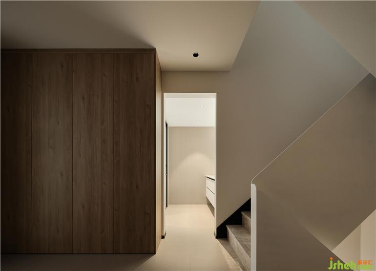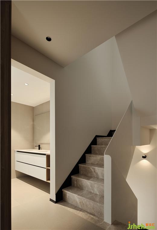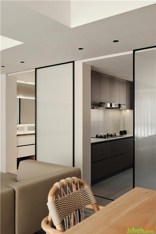 The porch, kitchen and guest bathroom are arranged in a word, and the glass sliding door with very narrow frame realizes the opening and closing conversion of space. The sliding door track shall be embedded in the ceiling to make sure the space is neat and clean. A small washing machine is placed in the washroom of the guest bathroom, and a top mounted washing and nursing articles display cabinet is on the opposite wall of the basin. Clean and tidy living space comes from adequate and reasonable storage.