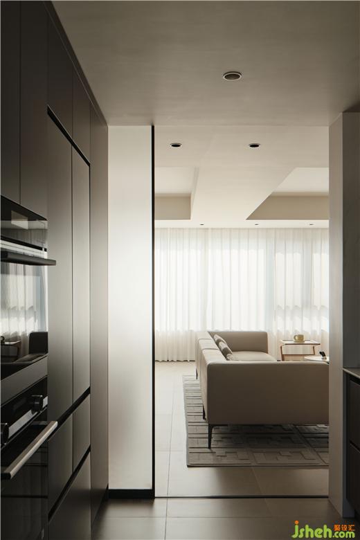 玄關(guān)、廚房、客衛(wèi)采用一字排列,極窄邊框玻璃移門實現(xiàn)空間的開合轉(zhuǎn)換。鎮(zhèn)江豪宅設(shè)計移門軌道預(yù)埋到吊頂里面,力求空間的整齊干凈??托l(wèi)的洗漱區(qū)放置了一臺小型洗衣機,臺盆對面墻是到頂?shù)南醋o用品陳列柜。干凈整潔的生活空間來源于充足合理的收納。