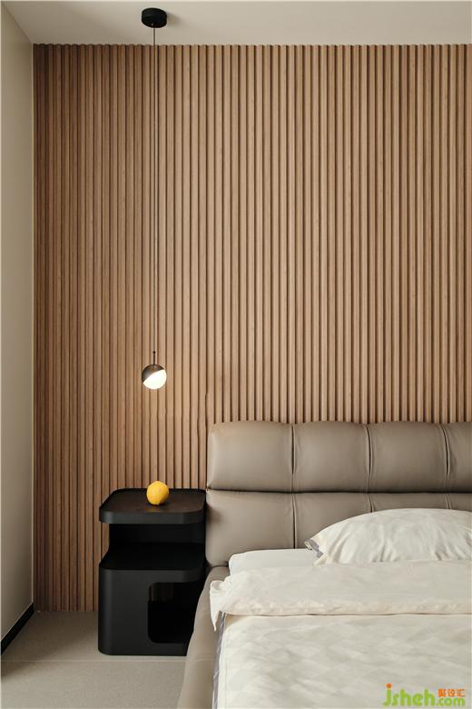 The original balcony on the second floor is open, allowing the master bedroom to directly reach the sun, which opens the space and broadens the mood. The bed background of the wood grid carves out the delicate side of the space. Customized black paint art support above the bedside long cabinet, with both functions and aesthetics.