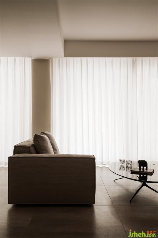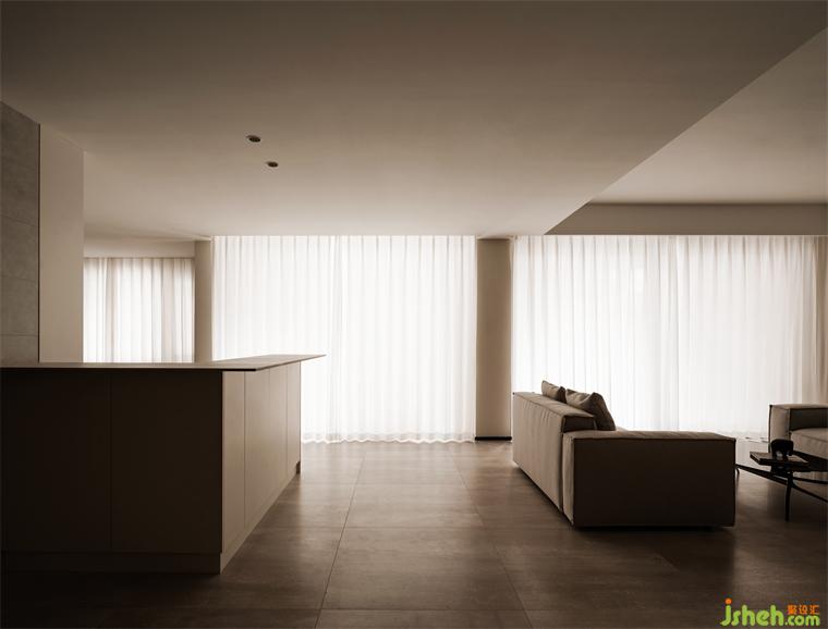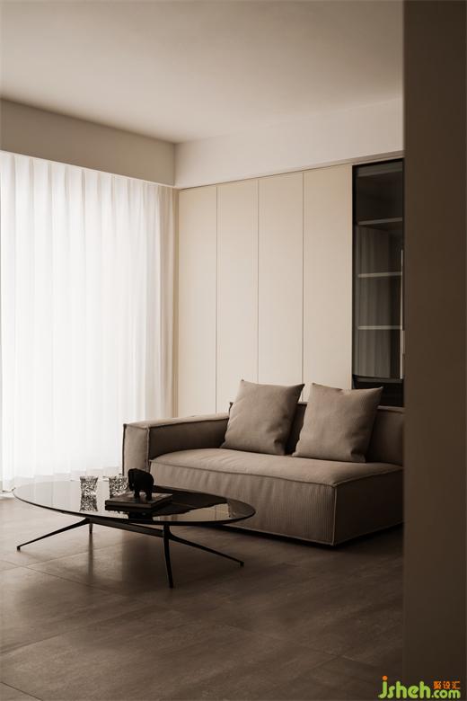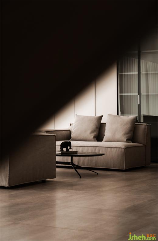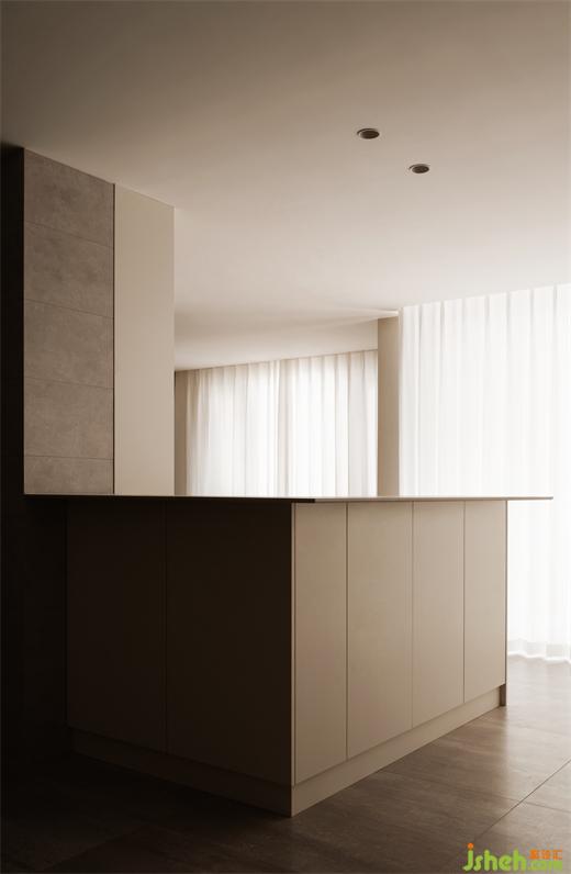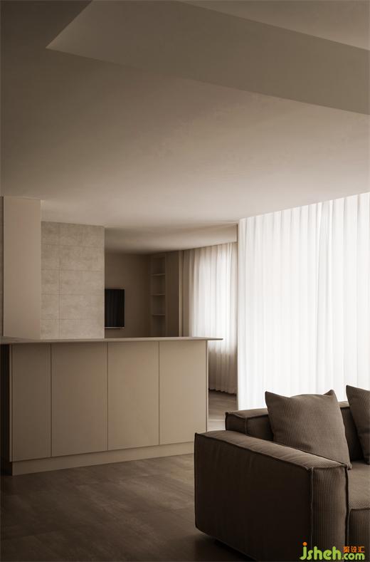 相向而坐的沙發(fā)后面L型水吧臺(tái)面,采用超薄巖板,樸素的表面肌理與精致的切割工藝相得益彰。
