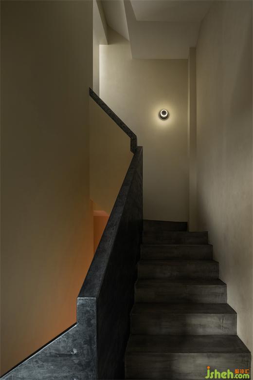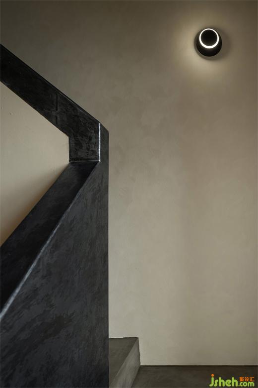米白色的空間輕盈靈動,深灰色的臺階探出一角。展廳設(shè)計(jì)青云色的扶手,墨水紋的臺階,走在其上好似踏水行云一般。扶手與臺階面都選用了深色,拐角處的墻面安放了一盞圓形的小燈。