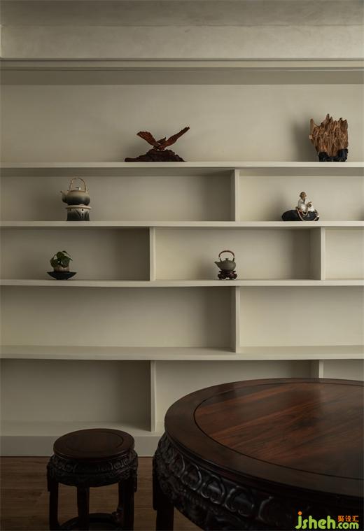 深色的中式家具與擺件,點(diǎn)綴在淺色的空間里,就像茫茫大海中露出的礁石。落座期間,如扁舟行于水間。煮茶對飲,四海皆友。