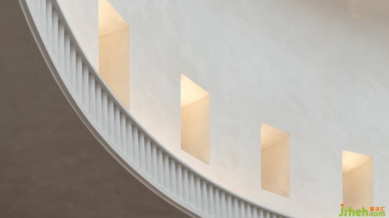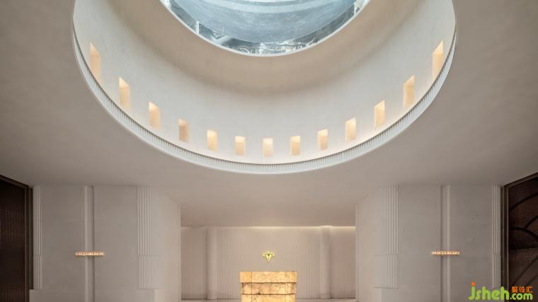 以方為基,嵌套圓頂構(gòu)建縱深,內(nèi)聚“向心力”;界面嚴(yán)謹(jǐn)圍合,墻面轉(zhuǎn)折柔和自帶規(guī)則豎紋肌理;玻璃穹頂傾瀉天光,仿若蒼穹之鏡——洗光趨柔,輕盈、柔和地灑落空間的每一寸區(qū)域。
