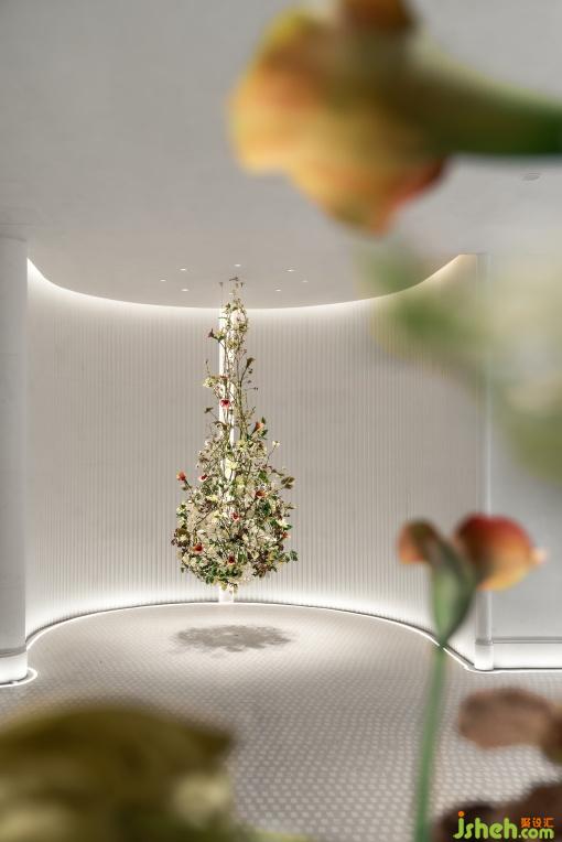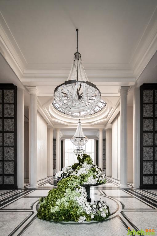 法式浪漫情愫,宛如為廳內(nèi)遮罩上一層輕薄曖昧的蕾絲面紗,光影交替若隱若現(xiàn),勾勒朦朧神秘的美好。藝術(shù)花藝形擬水滴,彌散香榭麗舍大街春日雨后花開的浪漫芬芳。