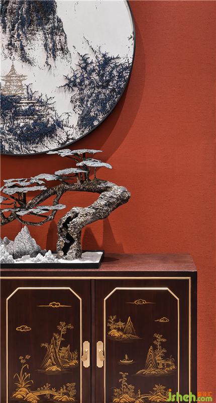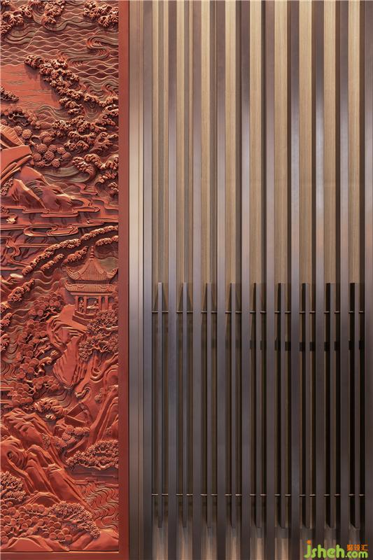 墻藝以木灰、金屬為胎,在胎骨上層層髹紅漆,多達(dá)一二百層,至相當(dāng)?shù)暮穸?,待半干時(shí)描上畫(huà)稿,然后再雕刻花紋?!暗耒U”元素結(jié)合全新科技手段,將工序復(fù)雜的傳統(tǒng)工藝“剔紅”完美呈現(xiàn),讓空間充斥著傳統(tǒng)氣息的同時(shí),引入盛京匠人的不滅精神。售樓處設(shè)計(jì)