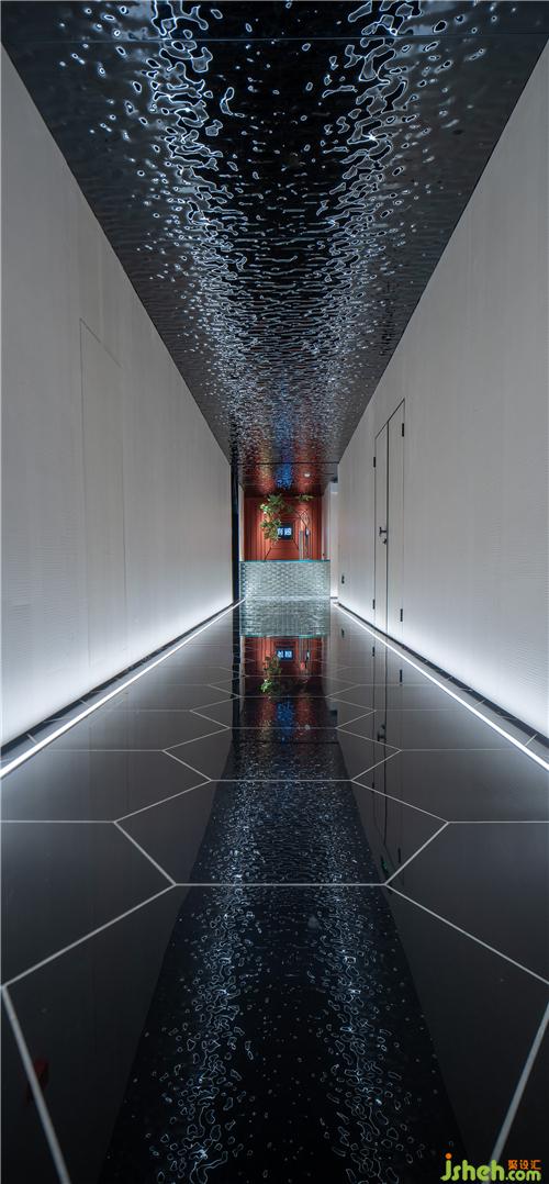 過(guò)道黑色六角形地磚以白色線(xiàn)條勾勒,水波紋不銹鋼頂面如波光粼粼的水面,縱深悠長(zhǎng)。