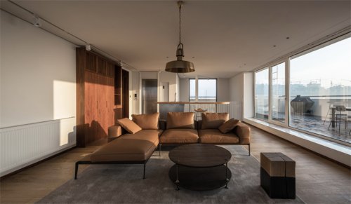 推開主入口實(shí)木大門,是一個(gè)藝術(shù)展示區(qū),兼具接待、藝術(shù)沙龍、展廳的功能。作為展廳時(shí),空間內(nèi)部的接待臺(tái)和休閑長椅可瞬間變?yōu)榘膳_(tái)和展臺(tái)。藝術(shù)空間和咖啡區(qū)由落地大玻璃窗隔開,兩個(gè)空間縱深相互延展。