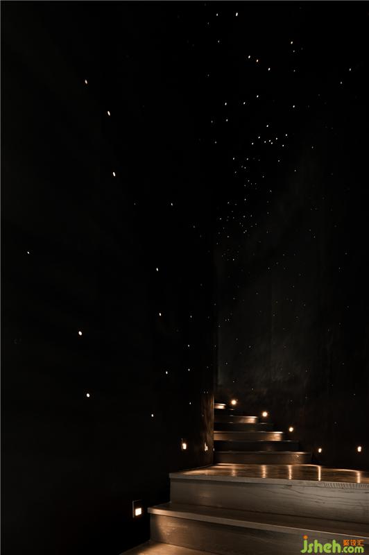 連接一層與二層的封閉式甬道,是黑暗的,作為空間的轉(zhuǎn)換、停頓乃至懸置,是空間行為關(guān)系中更深層次的體驗(yàn),因?yàn)槌颂?,黑夜里的群星同樣滋養(yǎng)我們的夢(mèng)想。