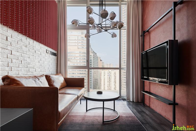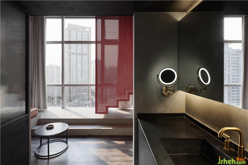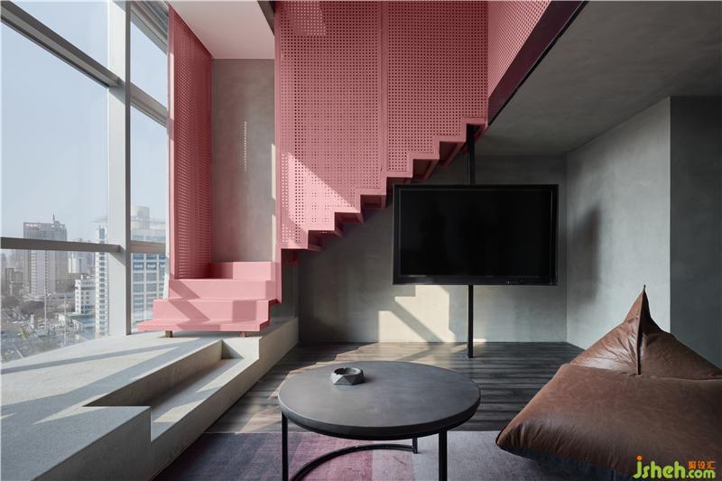 所以我們利用高挑的層高關(guān)系把整個空間上下一分為二,這不僅有效的利用了空間的使用率,酒店設(shè)計也從功能分區(qū)上進行了動靜關(guān)系的思考;一層空間便承擔起了公共區(qū)域的作用,客廳、衛(wèi)生間、儲藏空間被放置其中。這亦是一個動態(tài)的空間,我們運用工廠固有的一些符號,不斷強化著我們的視覺主題,體驗感在進入房間的第一刻便鋪面而來。