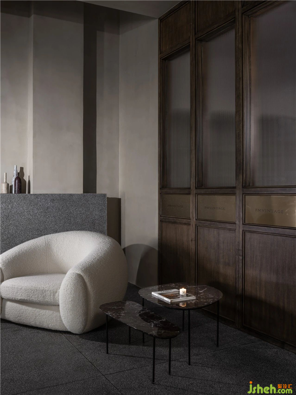 其次,展廳設計在軟裝的選擇上我們摒棄了統(tǒng)一風格產品扎堆的處理方式。而是以一個買手的姿態(tài)去挑選適合的家具產品。從Franco的Tre pezzi扶手椅,到Jean Royere的大白熊,再到當代傳奇設計師Philippe Starck的經典三足椅。無一不是向經典致敬。而flos的燈具與cc-tapis的地毯則是當下產品設計中的典范。我們將其整合在一起,在這個既沖突又奇妙的空間里,趣味橫生。