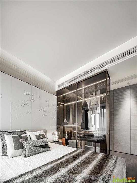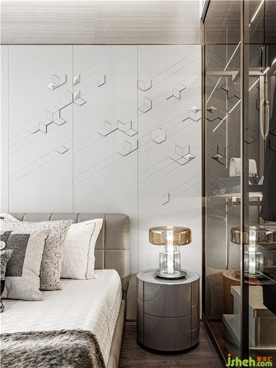 主臥背景以手工皮雕打造,與定制玻璃高柜完美結(jié)合,盡顯都市時尚感。