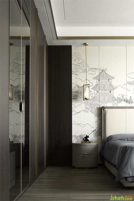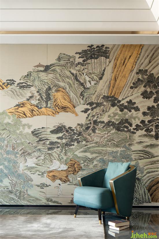 山水畫、大理石、木質板材相呼應