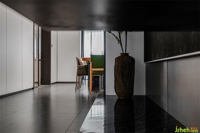 本案業(yè)主對家居設(shè)計的需求非常明確,他們不追求奢華的形式,但對品質(zhì)與內(nèi)涵非常注重,這些要點在入戶玄關(guān)的設(shè)計上集中體現(xiàn)出來。麗雅龍城住宅設(shè)計將入戶正對墻面做白色柜體與玄關(guān)墻,打破空間第一視覺的沉悶感,用藝術(shù)擺件與水墨畫點綴木飾面,內(nèi)斂、大氣,高級感油然而生。