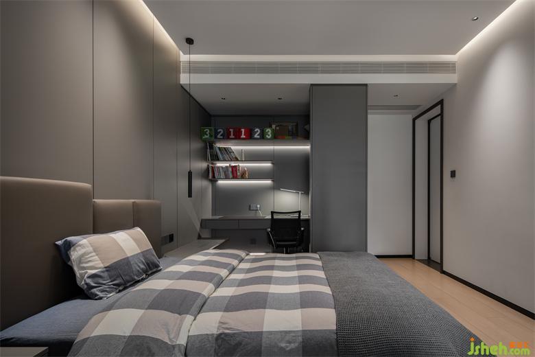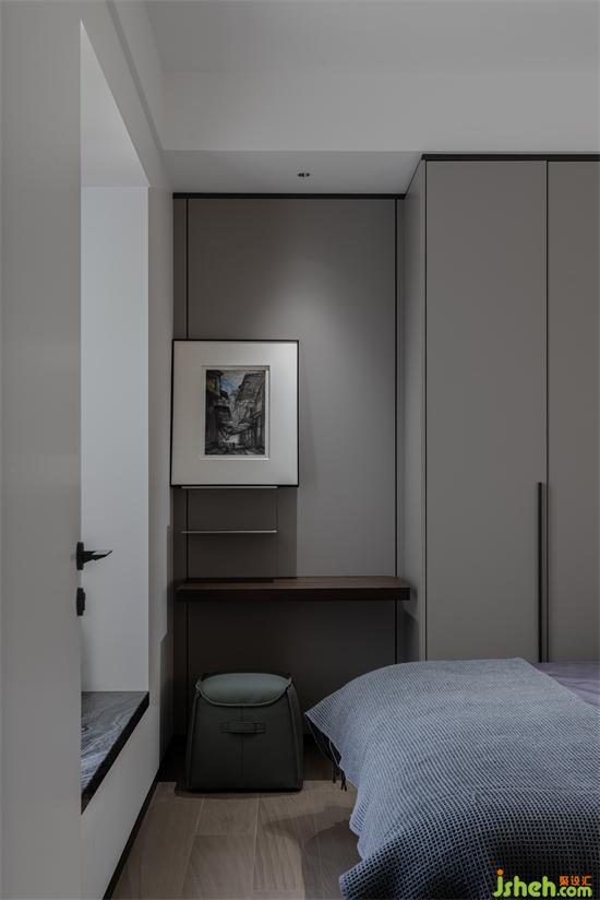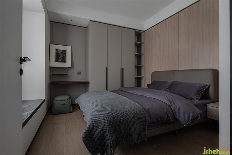 次臥用灰色與木色墻板相結(jié)合,麗雅龍城住宅設(shè)計打造豐富的視覺效果。漸進的層次、素雅的配色,都在為整個空間增添生活本源。